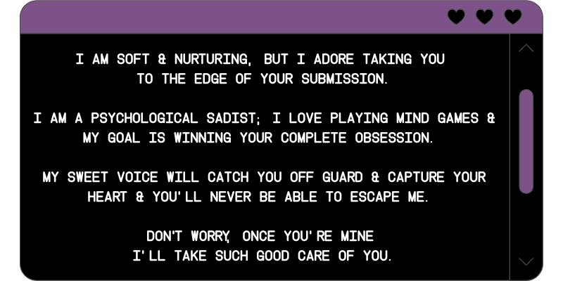 ABDL • Ageplay • Anal Training • Ass to Mouth • Bathroom Control • Begging • Blackmail • Blood Play • Body Writing • Bondage • Brainwashing • Branding • Branding • Breath Play • Castration Fantasy • CBT • CEI • CFNM • Chastity • Circumcision Fantasy • Clothespins • CNC • Coersion • Corruption • Cuckolding • Cult • Degradation • Discipline • Dollification • Dress Control • Edging • Enemas • Examinations • Exhibitionism • Exposure • Face Slapping • Facesitting • Family • Fear • Feminization/Sissification • Figging • Financial Domination • Fisting • Flogging • Foot Worship • Forced Orgasms • Futanari • Gags • Gaping • Giantess • Gooning • Humiliation • Hypnosis • Ice Cubes • Interrogation • Intox • JOI • Kidnapping • Knife Play • Masks/Hoods • MDLB • MDLG • Medical • Milking • Mind Fuck • Mommy • Mummification • Murder Fantasy • Needle Play • Objectification • Orgasm Control • Orgasm Denial • Outdoor • Pantyhose/Stockings • Pegging • Pet Play • Piercings • Poppers • Post Orgasm Torture • Praise • Primal • Religious • Remote Controlled Vibrator • Restraints • Reverse Harem • Roleplay • Rules • Servitude • Slave Bells • Slave Training • Spanking • SPH • Spit • Spitting • Step/Incest • Succubus • Taboo • Tattoos • Teasing • Therapy • Torture Fantasy • Underwear • Vampire • Voyeurism • Watching Porn • Watersports • Wax Play • Weight Control • Wetting • Witchcraft • Worship